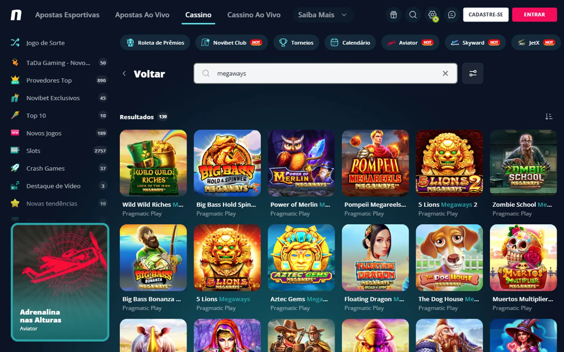 O grande diferencial da Novibet é o tamanho de seu catálogo. Enquanto na plataforma tem mais de 3.000 slots, 139 são com a mecânica Megaways.