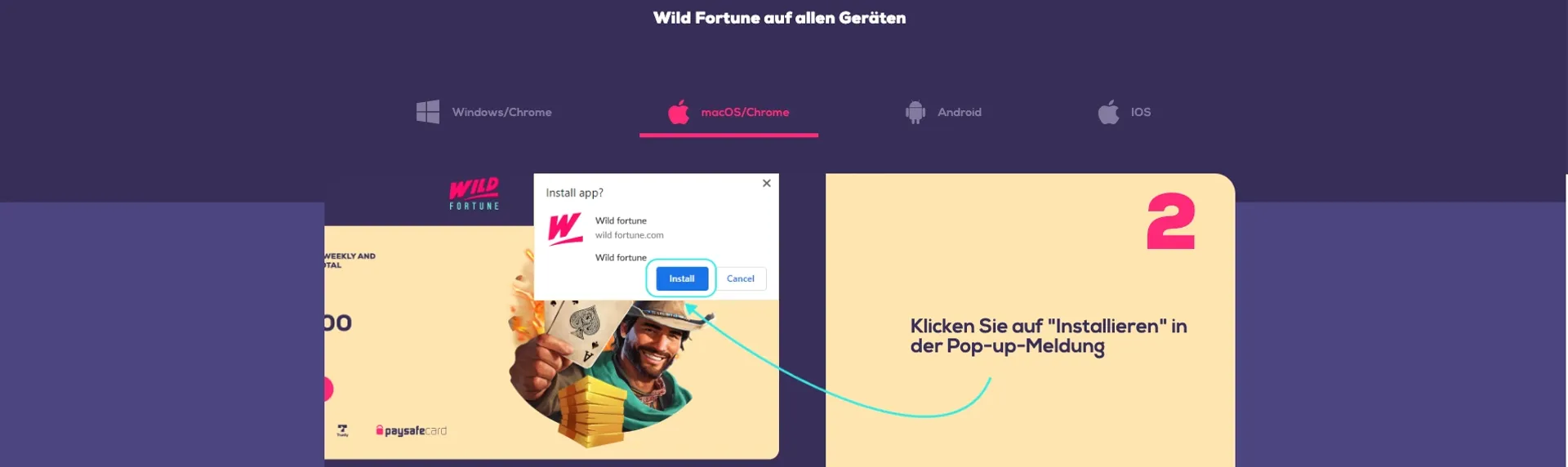Auf der Website von Wild Fortune befindet sich in der linken Menüleiste die Option „App installieren“. Mit nur einem Klick können die Kunden sich darüber ihr Online Casino auf das Smartphone holen. Wer keine Wild Fortune App installieren möchte, kann aber auch ganz einfach über den Browser seines Geräts spielen. Beide Varianten ermöglichen den Zugriff auf das Spielangebot, Ein- und Auszahlungen sowie die Nutzung aller weiteren Funktionen von Wild Fortune.