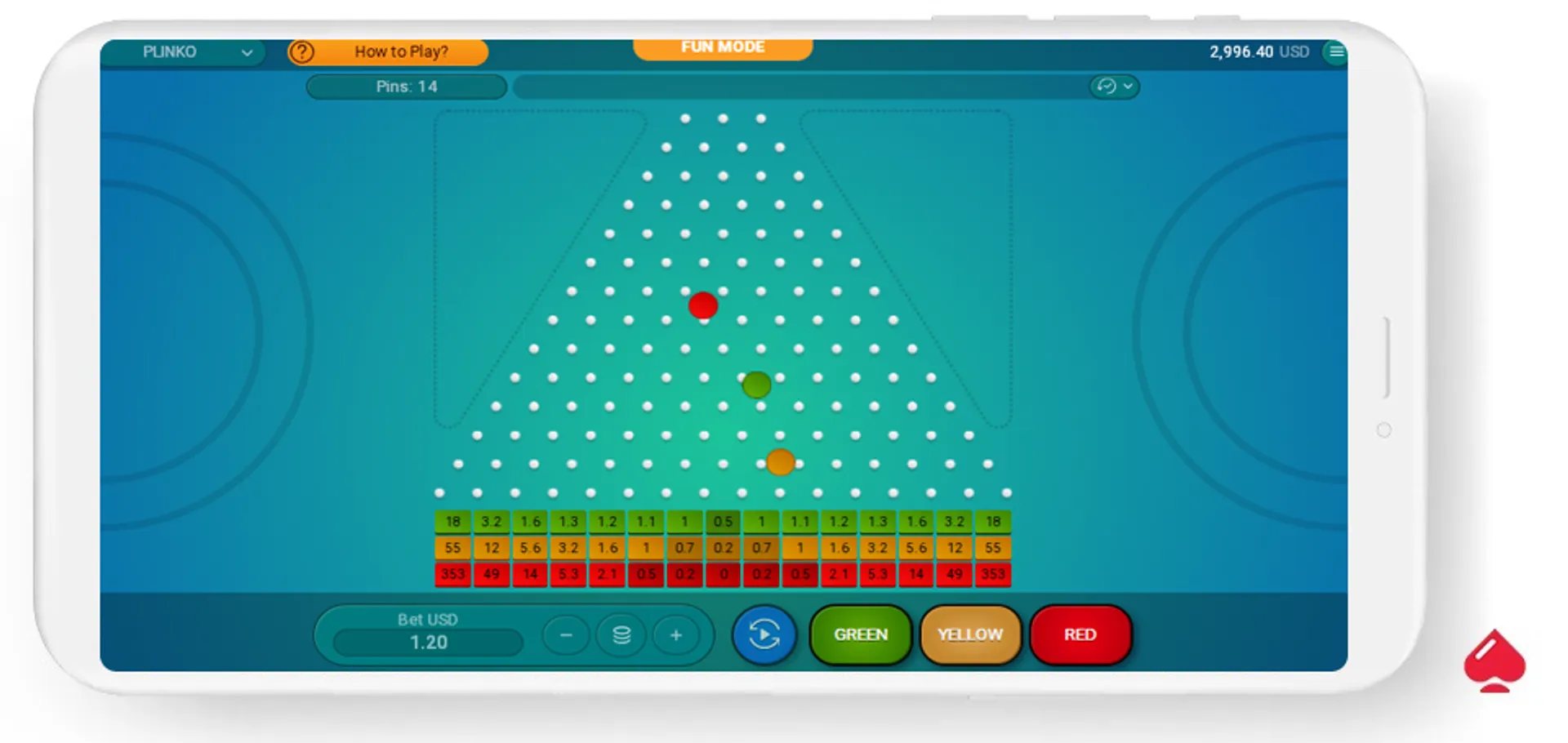 La versión de Plinko del proveedor de software Spribe es una de las más populares en los casinos online en español. Hace parte de su serie de juegos Turbo, que incluye otros minijuegos como Hi Lo, Keno o Mini Roulette. En este caso, se utilizan bolillas de color rojo, verde y amarillo. De igual forma, se puede configurar el número de clavijas y la dificultad del juego.