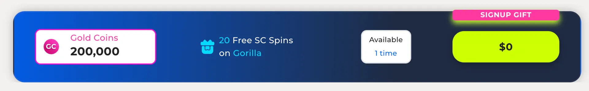 Yes, the Freespin bonus offers 200,000 GC and 20 free SC spins on Gorilla (DiceLab) when you first sign up. There’s no promo code required.